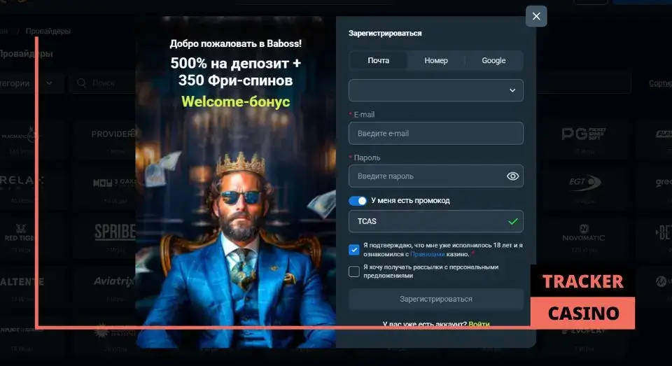 Заполняя форму на сайте, можно заметить кнопку-переключатель У меня есть промокод, нажав на которую открывается специальная строка для ввода бонускода. Специально для обзора на Baboss casino добавим, что на этом моменте каждый желающий старше 18 лет может ввести уникальный промокод от нашего сайта и получить дополнительный приятный бонус.
