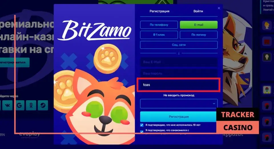 - Заполнение регистрационной анкеты с промокодом. Из пяти способов создания профиля предлагается выбрать какой-нибудь один, после чего – приступить к заполнению анкеты. Отдельное внимание – надписи «У меня есть промокод». Именно она нужна пользователю, который решил получить дополнительный бонус. Нажав на нее, в появившейся графе можно по желанию указать Bitzamo промокод tcas (именно маленькими буквами!), чтобы разблокировать доступ к ряду подарков, среди которых – бездепозитный приз размером в 50 денежных единиц сразу на баланс.
