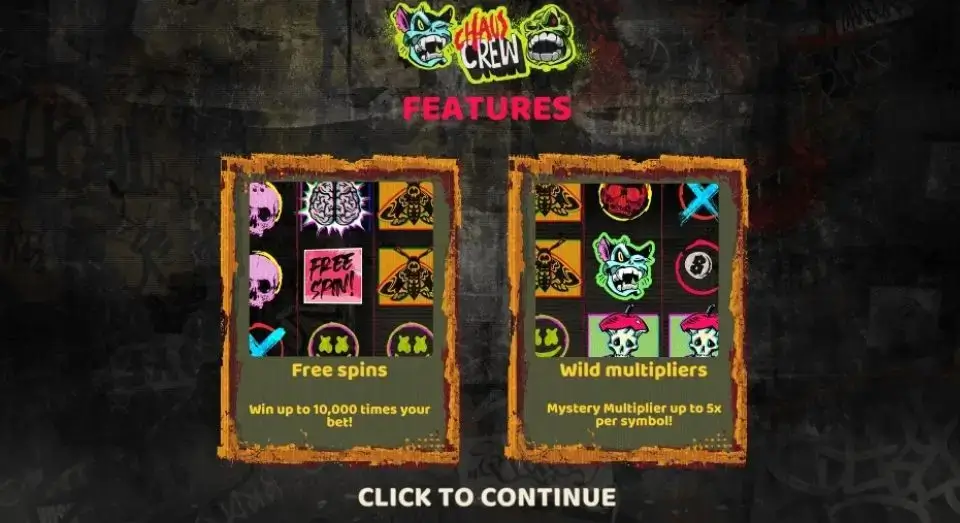 Захватывающий слот Chaos Crew выполнен в стиле панк. В нем игрока ожидают устрашающие персонажи, которые не только познакомят с искусством уличного граффити, но и погрузят в мир хаоса, в котором можно заработать крупные выигрыши.