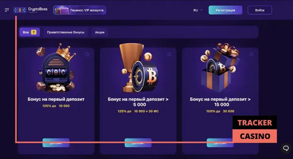 - Возможность выбрать один из трех депозитных бонусов в Cryptoboss. Но не только бездепозитные фриспины можно получить при регистрации в данном заведении. Cryptoboss casino промокод сохраняет возможность активации бонуса на первый депозит, причем пользователю предлагается три разных варианта: минимальный, средний и максимальный. Но об этом – чуть позже.