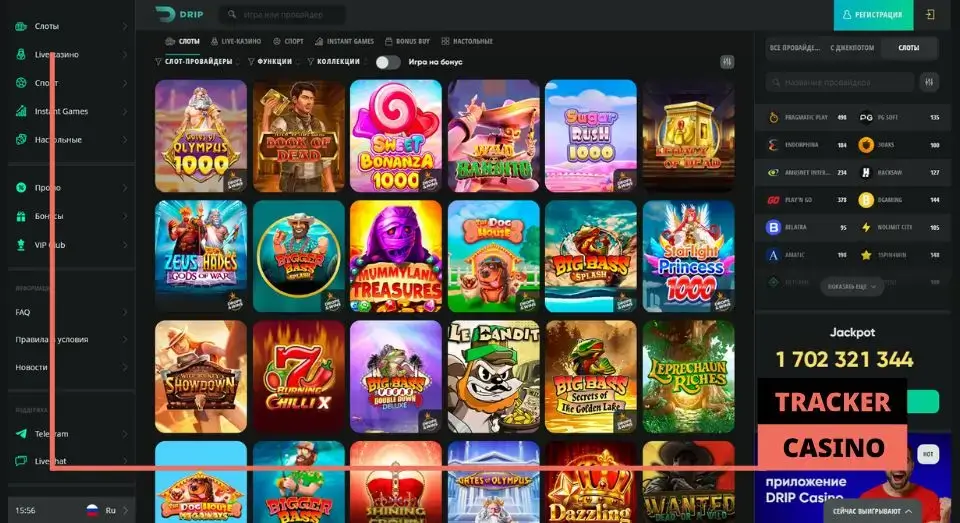 На главной странице casino Дрип находятся игровые автоматы, разделенные на такие категории, как Популярные, Новые, Лайв игры, Игры с джекпотом, Игры для хайроллеров и многие другие. Здесь также можно ознакомиться с самыми интересными акционными предложениями, действующими на текущий момент. Справа доступны дополнительные настройки фильтра.