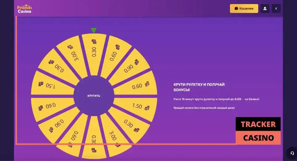 - Колесо фортуны с прокрутками каждые 15 минут. Friends casino промокод tcas – это уникальный подарок, который сложно встретить где-либо еще, а именно – доступ к колесу фортуны. Он предоставляется на постоянной основе, и пользователь каждые 15 минут может совершать прокрутку, рискуя без всяких затрат выиграть до 3 денежных единиц сразу на основной баланс.