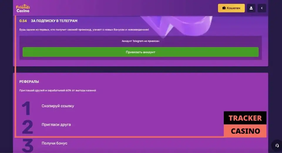 - Деньги на основной счет за выполнение простого квеста. Промокод для Friends casino приносит еще один эксклюзивный бонус: использовав его при регистрации, игрок может привязать аккаунт к Telegram, подписаться на паблик казино – и получить 50 денежных единиц на счет. Чем не приятный бонус?