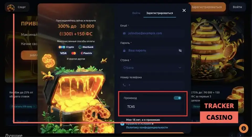- Далее обратите внимание на строку «Промокод». В интерфейсе регистрационной анкеты присутствует специальный переключатель, то есть ползунок, который нужно сдвинуть либо кликнуть по нему, чтобы появилось поле для ввода бонусной комбинации. Если вы нажмете на саму графу, то ничего не произойдет. Но если вы кликнете по голубой точке справа, перед вами появится новое поле. Там-то и нужно указать наш Honey Money Casino промокод – TCAS.