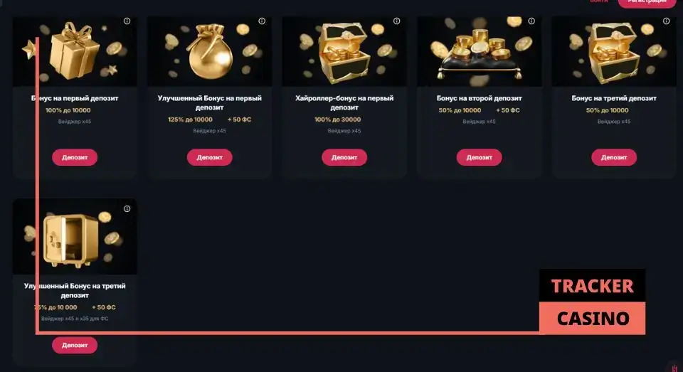 1 | 125% (до 10 000) + 50 FS | 5 000 | x45 для депозитного бонуса, x35 для фриспинов |