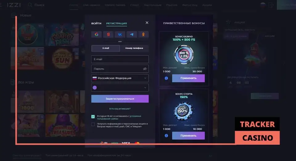 Открыть счет в Izzi casino проще простого. Для начала необходимо пройти регистрацию одним из удобных способов. Сделать это можно с помощью социальных сетей либо заполнив специальную форму на сайте казино, где необходимо указать e-mail/номер телефона, пароль, страну и валюту, в которой будет удобно пополнять баланс. Так как это платформа с азартными играми, потребуется подтвердить возраст старше 18 лет и дать согласие на обработку данных. Для тех, кто желает получать уведомления о новых акциях и бонусных предложения казино Иззи, на данном этапе можно дать на это согласие, отметив галочкой нужную область.