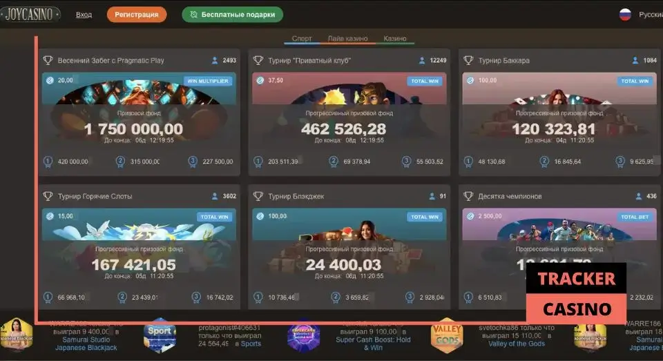 На сайте казино Джой представлено множество захватывающих мероприятий, которые могут принести яркие эмоции и большие выигрыши. Участие в турнирах и конкурсах могут принимать как 10000 пользователей, так и менее 500. В каждой карточке данных видов соревнований можно найти информацию касательно списка доступных игр, размера призового фонда и многое другое.