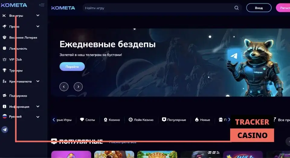 Зайдя на официальный сайт Kometa casino, открывается приветливая главная страница с множеством интересных слотов. Первым бросается в глаза раздел с текущими акциями и бонусными предложениями. Здесь игроков встречает дружелюбный енот Ракета, который предлагает звездный приветственный пакет и прочие бонусы, а также персонажи из известных игр с не менее привлекательными предложениями. Большую часть страницы занимают популярные разделы с играми. Их череду прерывают разнообразные баннеры, рекламирующие программу лояльности казино, его преимущества и многое другое.