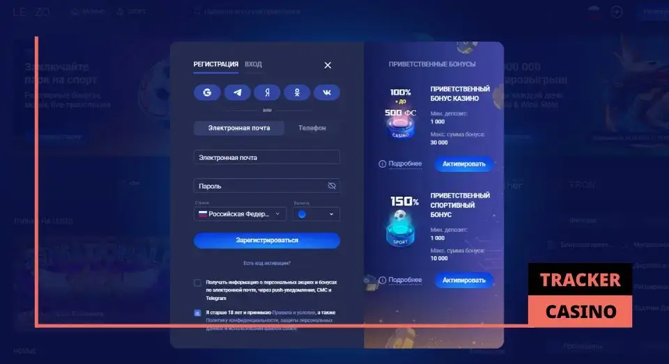 Зарегистрироваться на сайте Legzo можно по номеру телефона либо по адресу электронной почты. Также доступен вариант прохождения данной процедуры с помощью уже существующего аккаунта в одном из мессенджеров. Здесь необходимо указать надежный пароль, страну проживания и валюту, в зависимости от нее.