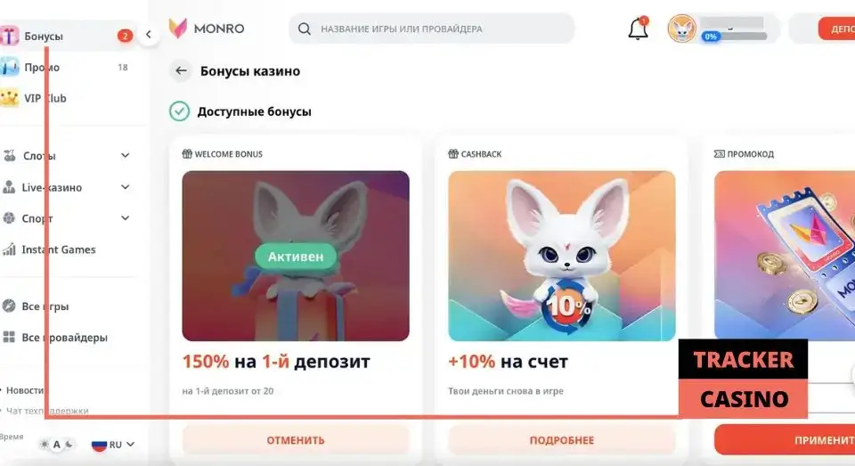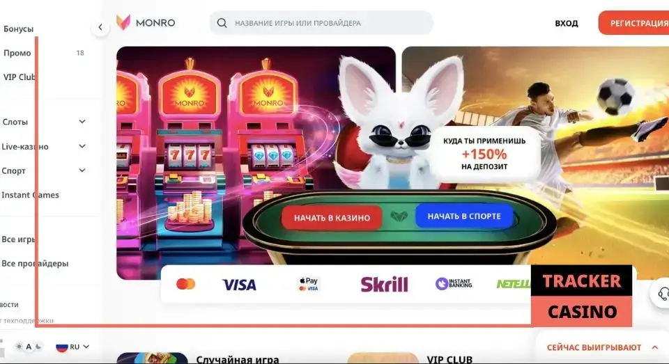 Игорная площадка Монро – один из самых стильных и симпатичных игорных ресурсов, осуществляющих свою деятельность онлайн. Славится казино не только красивой картинкой, но и разнообразием развлечений, большую часть которых можно протестировать бесплатно. В данной статье мы расскажем, как активировать в Monro casino промокод TCAS при регистрации, чтобы начать игру со 100 бездепозитных фриспинов, а также депозитных бонусов на слоты и ставки на спорт.