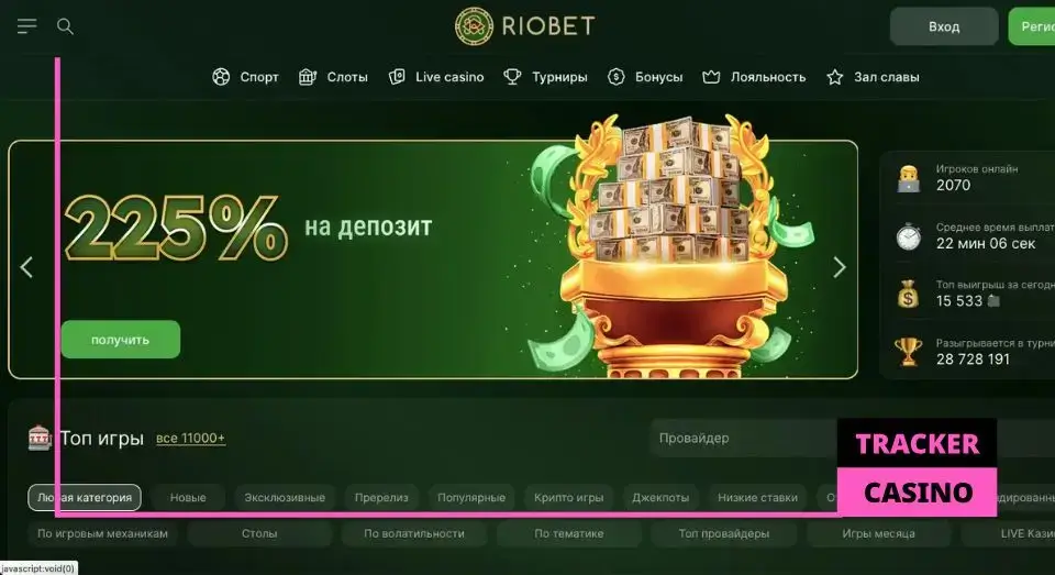 Меню сайта Riobet casino и опция поиска находятся в крайней левой части шапки. В частности, в меню можно найти основные категории, о которых упоминалось чуть выше, а также такие разделы, как: квесты, новости, вопросы и ответы.