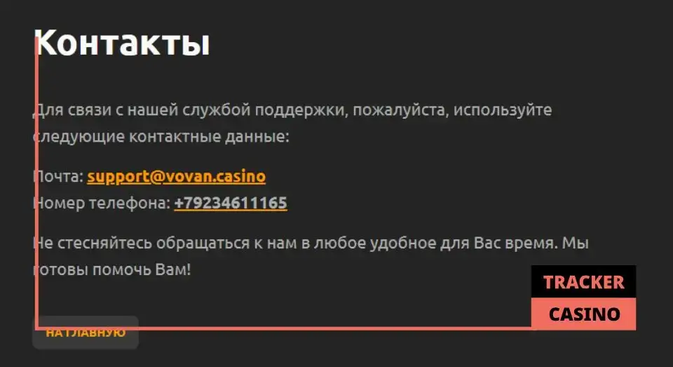 Получить консультацию или ответ на конкретный вопрос от саппорта можно в любое время суток. Если обращаться через чат, то отклик от специалиста поступит в кротчайшие сроки. Также заметьте, что на сайте casino Vovan доступна опция Заказать звонок. В этом случае необходимо ввести номер мобильного телефона и вам перезвонят.
