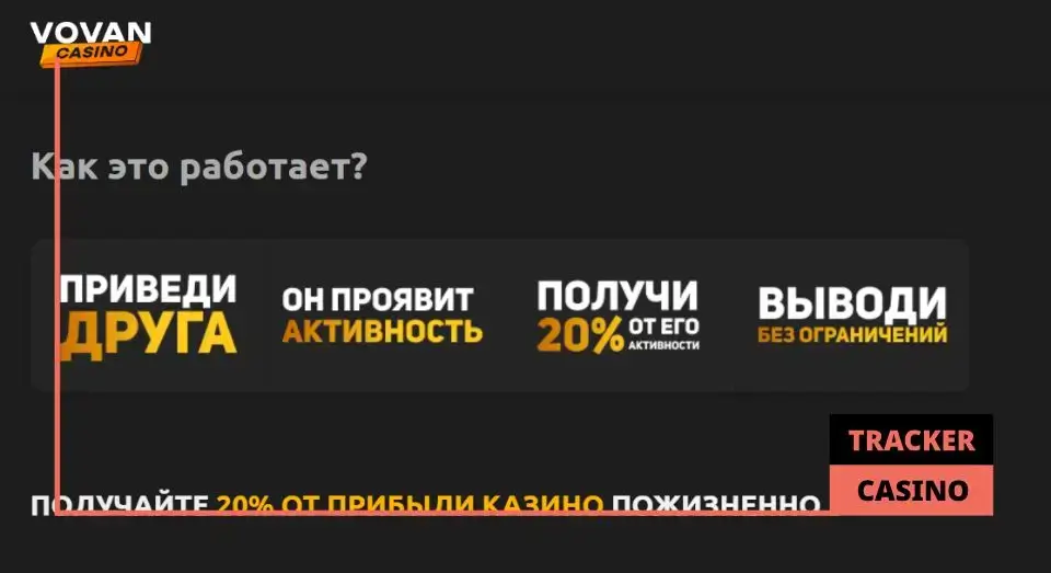 Еще отметим в обзоре Vovan казино, что данная платформа имеет в своем арсенале реферальную программу, которая позволяет получать до 20% от прибыли казино с реферала. Каждый приглашенный друг – это приятные бонусы, еженедельные поощрения и доступ к эксклюзивным гонкам, в которых выдаются по-настоящему крутые призы. Больше о программе читайте также в разделе Информация.