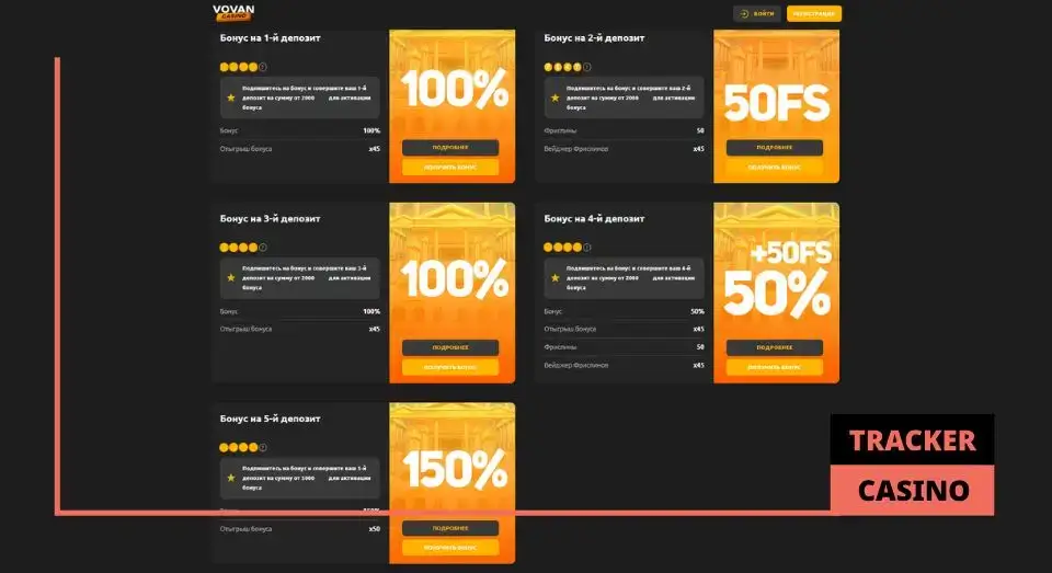 - Остаются доступны крупные бонусы от Vovan casino на последующие депозиты. Компания Vovan casino старается сделать так, чтобы у гемблеров сложились исключительно положительные первые впечатления от игры. Поэтому, помимо стандартного приветственного бонуса, пользователи получают еще и призы за второе, третье, четвертое и даже пятое внесение средств на баланс.
